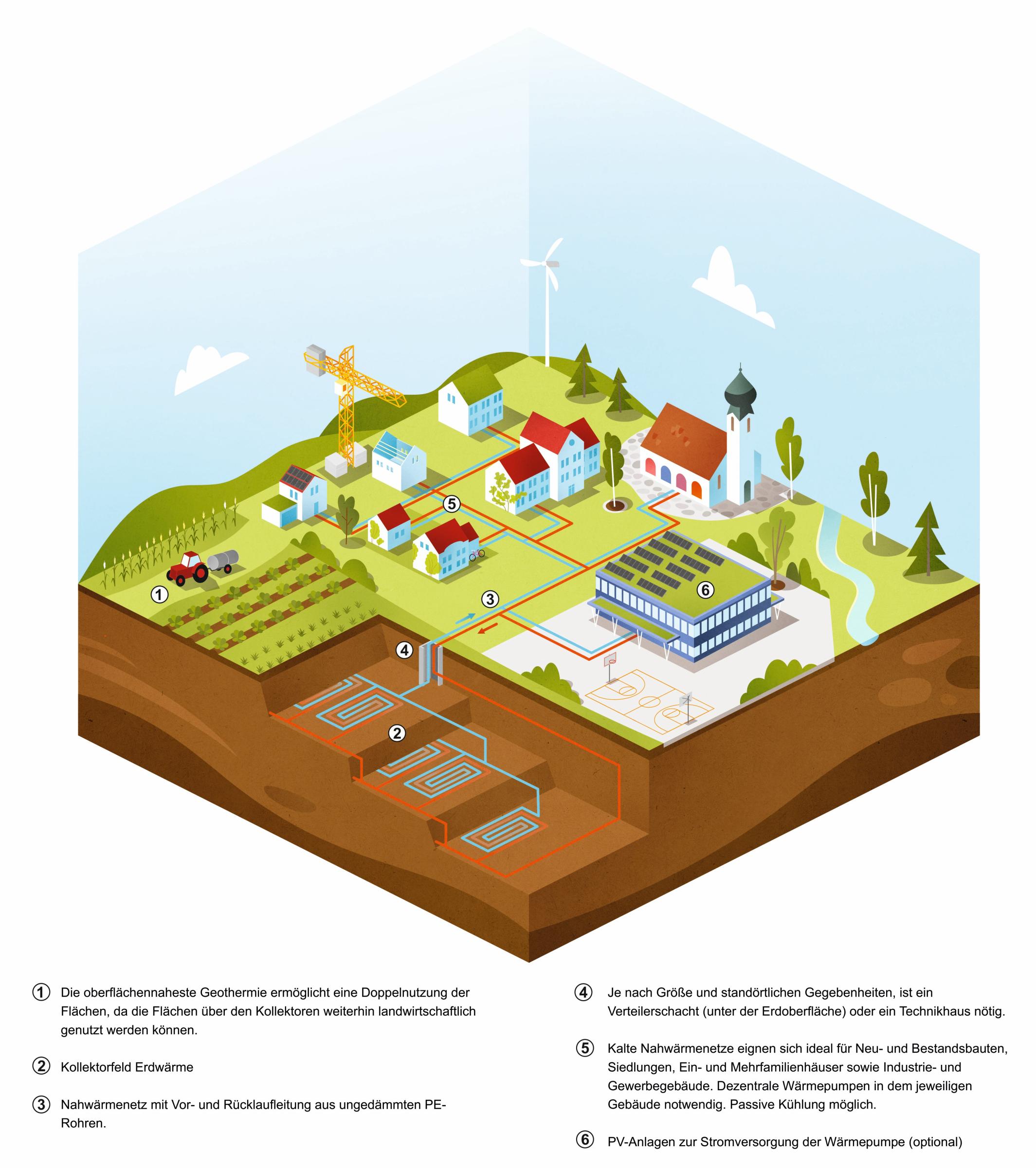 Kalte Nahwärmenetze sind eine innovative Lösung für die Wärmewende in Bayerns Gemeinden. Im Vergleich zu klassischen Nahwärmenetzen, wie sie bei Hackschnitzel- oder solarthermischen Anlagen üblich sind, arbeiten kalte Nahwärmenetze mit lokaler Erdwärme. Im Winter, um Gebäude energieeffizient zu beheizen und im Sommer um klimafreundlich zu kühlen. Gerade angesichts steigender Temperaturen und längerer Hitzeperioden bieten sie einen spürbaren Vorteil für kommunale Gebäude, Siedlungen und Vereinsstätten gegenüber herkömmlichen Nahwärmenetzen.